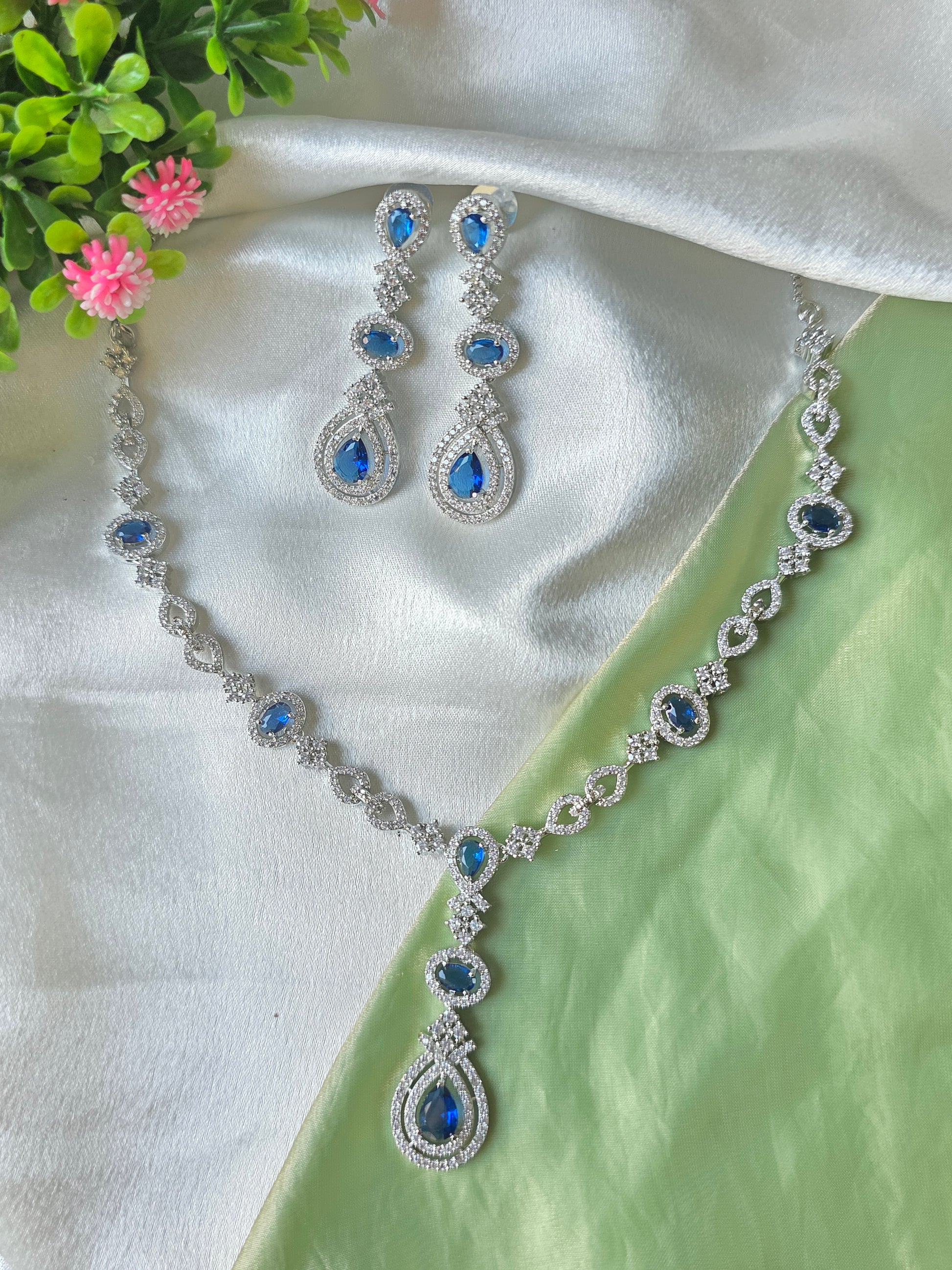 The Corsica Blue AD Necklace Set captures the essence of coastal elegance and timeless beauty. Adorned with deep ocean-blue stones framed by sparkling American Diamonds, this design reflects a serene sophistication reminiscent of Mediterranean charm. Its intricate detailing and graceful drop pattern make it a perfect choice for evening galas, festive occasions, and bridal celebrations. Pair it with any outfit to add a refined, royal allure that never goes unnoticed.